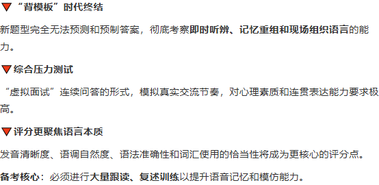 题量减为11题,时长8分钟。仅保留两大题型:听后重复:听一句话或短对话,然后原样复述。